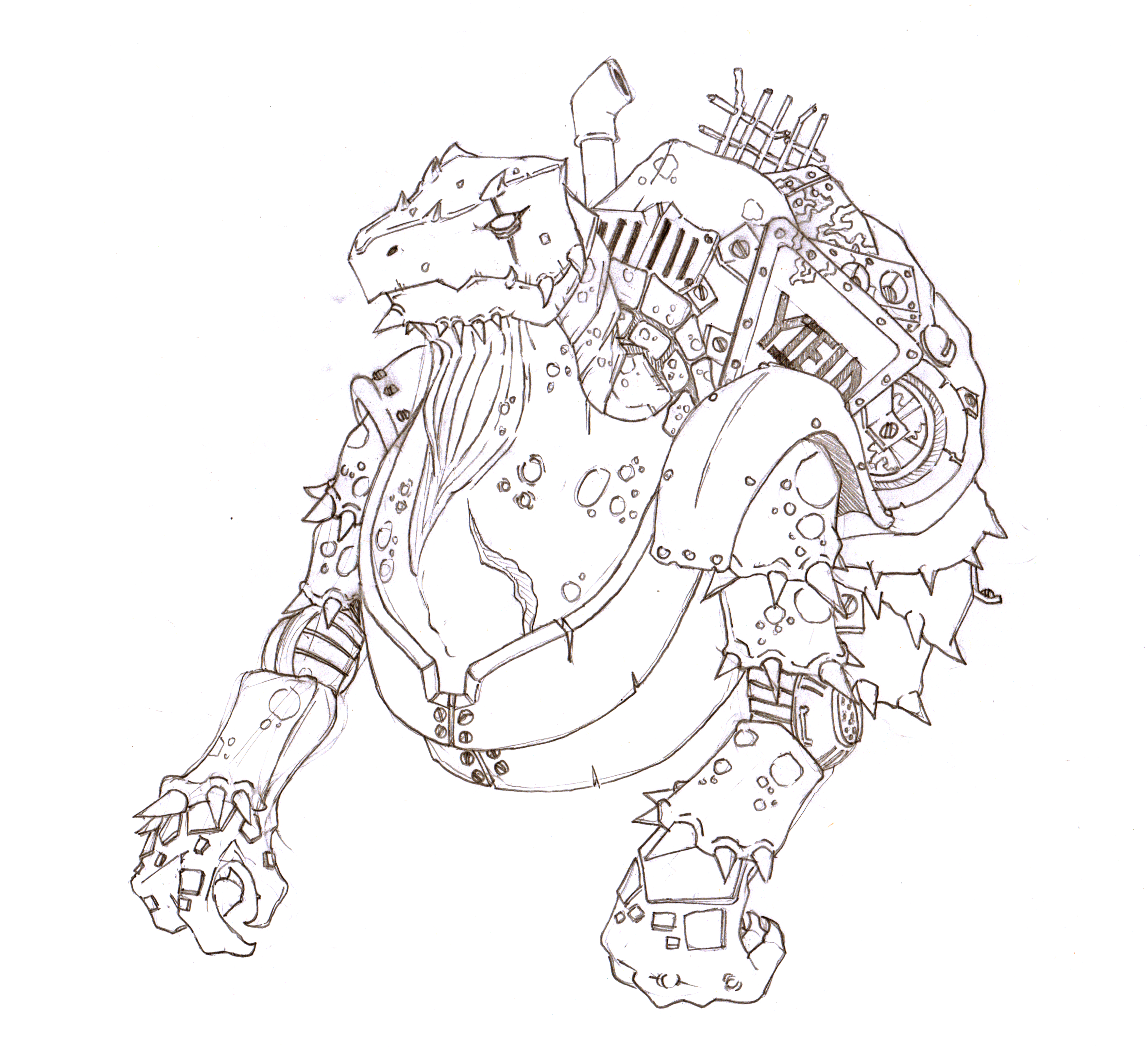 Captain Scrap is the intellectual property of 'Nerdy Show' the podcast network and 'Lightning Dogs.' One of the many characters and potential villains brainstormed by the funny folks at Nerdy Show on their Lightning Dogs podcast. When the podcast originally aired I found myself continuously entertained if not laughing uproariously. Captain Scrap was a brillaint character, and I began sketching while listening. Much like Orks from Warhammer, the idea of scrappy, bolted together apocalypse characters are very appealing to me, so the Piratical Mutant Turtle turned walking junk pile immediately stood out to me. I liked the original sketch so much that I scanned and coloured it.